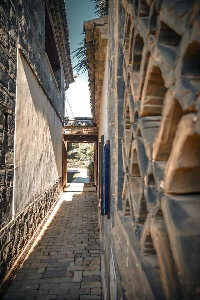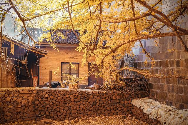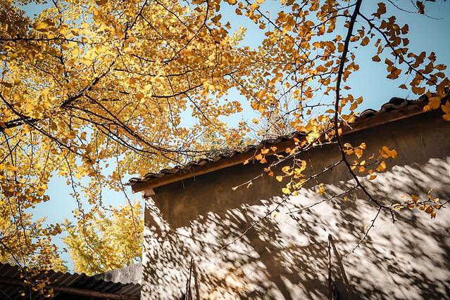 在银杏村里没有目的地的到处走,一不小心就会“转角遇到爱”。一个废弃的院落出现在眼前,我看见了角落一颗巨大的银杏树,这个小小的院落都被覆盖在树荫之下,阳光透过树枝洒落在银杏叶铺成的金色地毯上,这个画面真的静谧而美好。