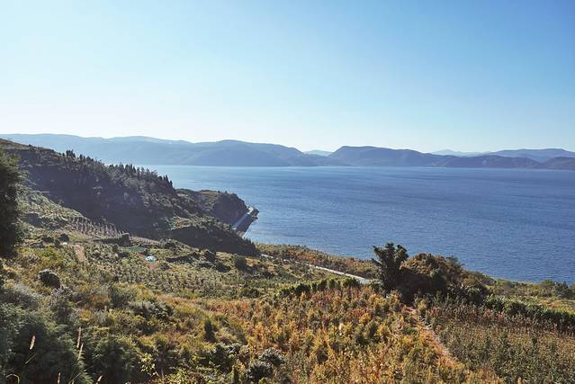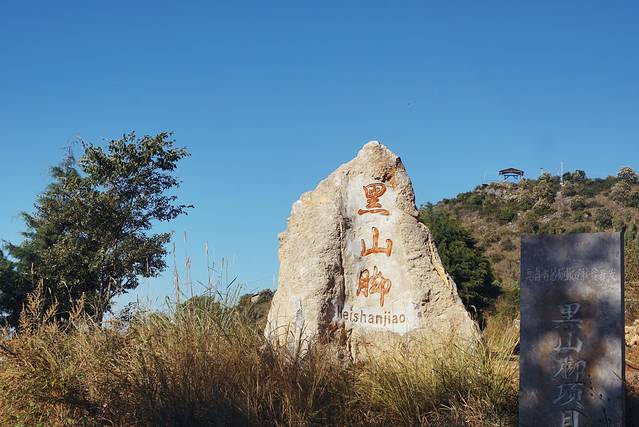 山路开了不多久,到了一个叫黑山脚的地方。这里虽然海拔不高,但俯瞰抚仙湖已经拥有不错的视角啦。抚仙湖的形状很像一只大鸡腿,磨豆山所在的南岸是“鸡腿”的鸡脚部分,所以看起来比较窄一些。
