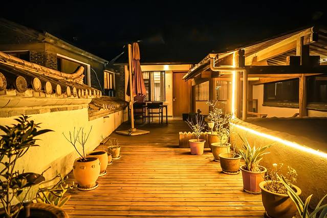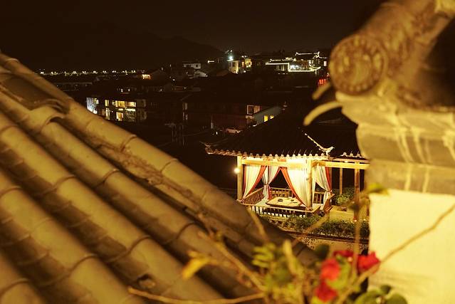 客栈的夜景也很美哦。这家客栈是分东楼和西楼的,两幢楼相邻但不相通。从我们的露台望出去,隔壁有个小亭子,那里就是客栈的另一幢楼啦。