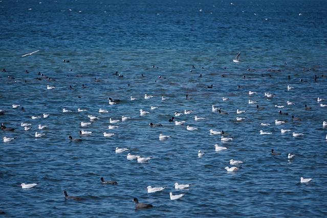 近岸的湖面上密密麻麻的小白点。惊起飞鸟一片的场景真是乌泱泱的,让密恐患者寒毛直竖。