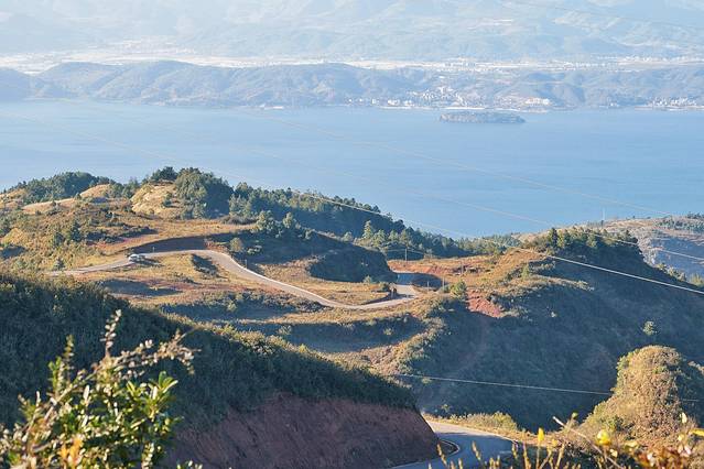 从地图上看,磨豆山就在抚仙湖南岸边上。从东岸的太阳山小镇开到山脚下再一路盘山到山顶也有五六十公里之远。导航说的一个半小时车程是绝对不作数的,远远不止,两个半小时还差不多。虽说这是个野路子景点,但盘山路况也还行,除了路窄点,也没啥大问题。导航一般会给出两条路线,一条是沿湖的,另一条穿山。尽量选沿湖的那条路呗,风景好,还不容易遇上集卡。