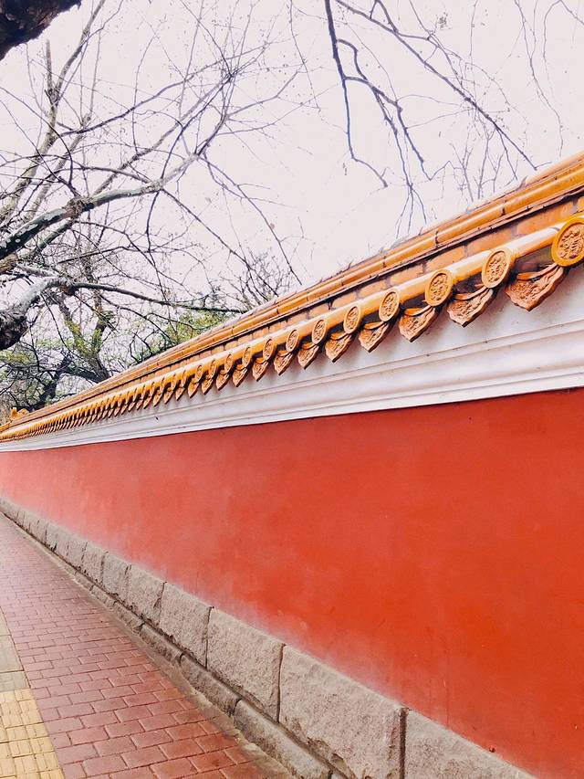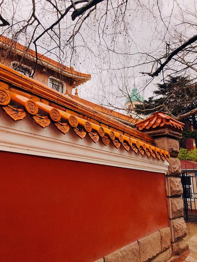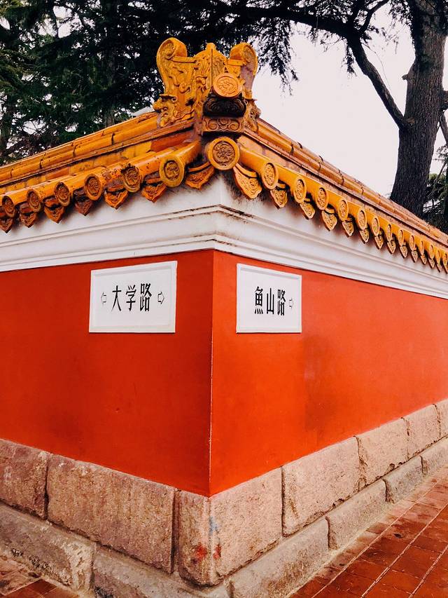 青岛老城这里有一条网红路,红墙姜黄色琉璃瓦,有种北京故宫的味道。来都来了去凑个热闹,虽然说不见得多么神奇,但是大学路和鱼山路的这个交汇点仿佛有种神奇的魔力,两个不同的方向,有着不同的色彩,在纠结着走哪个方向好呢?