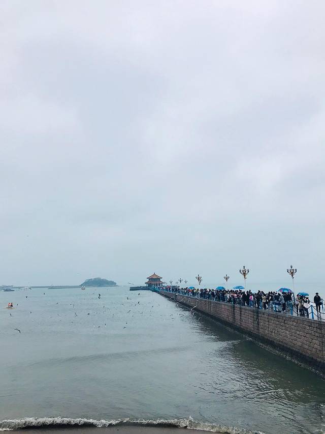 青岛栈桥始建于清光绪十八年(1892年),是青岛最早的军事专用人工码头建筑,是青岛的重要标志性建筑物和著名风景游览点,位于游人如织的青岛中山路南端,桥身从海岸探入如弯月般的青岛湾深处。桥身供游人参观并在此停靠旅游船,由此乘船可看海上青岛。风浪太大,对于乘船没有丝毫的兴致。