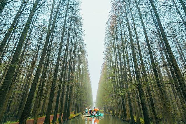小火车下了站,便要乘坐竹筏游览这里最富盛名的“一线天”景观,5000多亩的水杉林、3000多亩的芦苇荡,我们去的时候是四月初,相信这里到了六七月份郁郁葱葱的绿树茂盛的生长起来的时候,一定会更美!