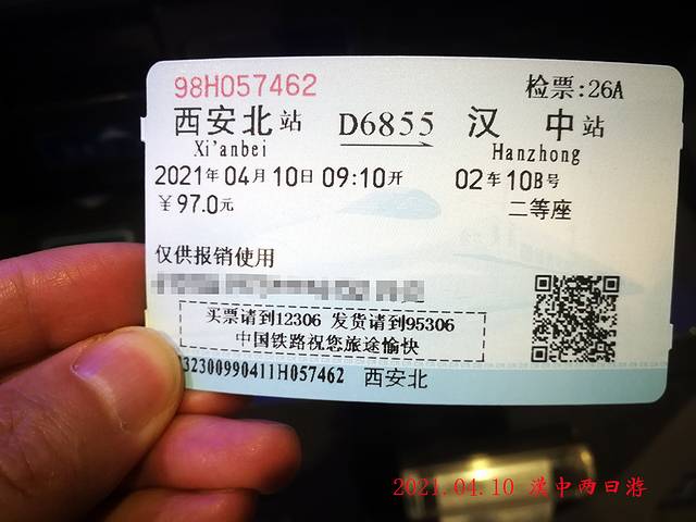 4月10日,我们在西安北站汇合,坐9:10分的D6855次列车,经停鄠邑、城固北两站,10:33分到达汉中站。
