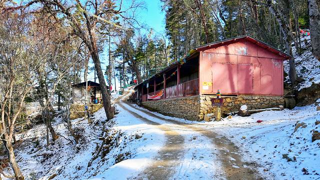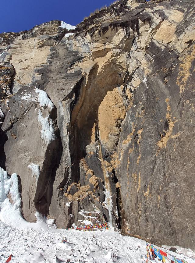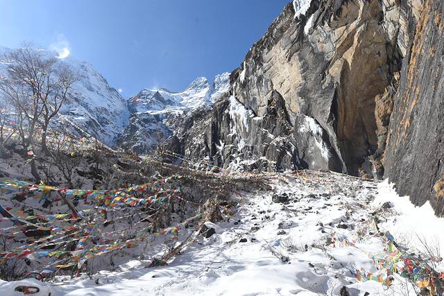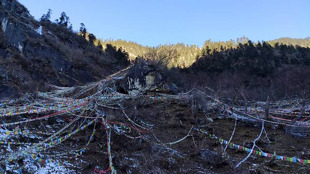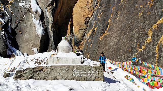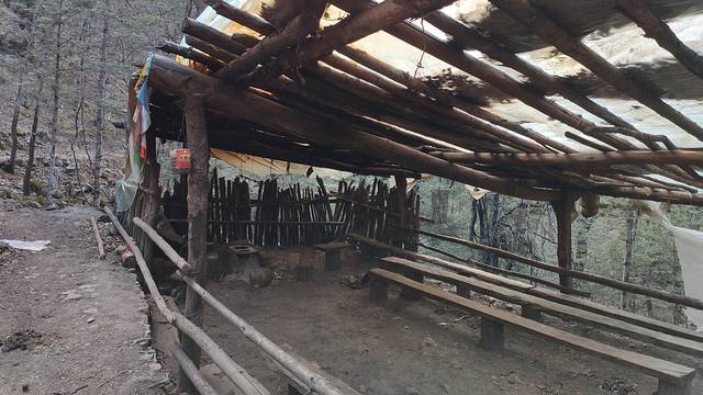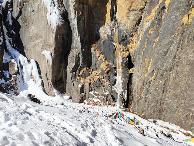 照片中倒塌的建筑是被雪崩摧毁的。到了乃农,就离神瀑接近了,此时时间9点40分,差不多走了一个来小时。