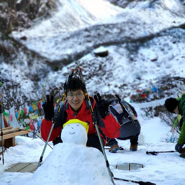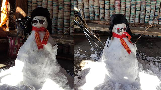很有个性的雪人,可是不是我的杰作,是一位叫“小牦牛”的领队和另一位哥们搭的。但是我们提供了帽子和眼镜。偷笑小蚂