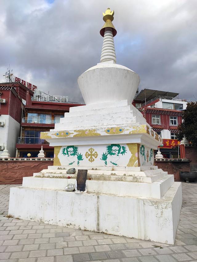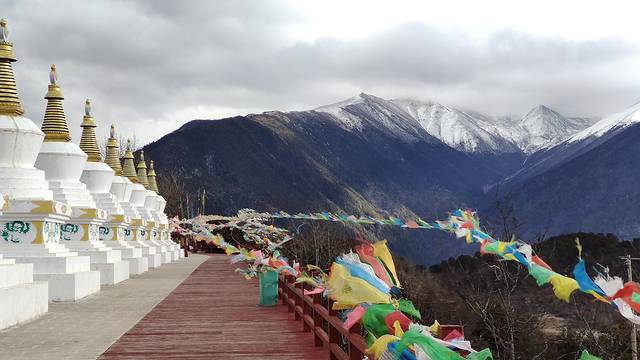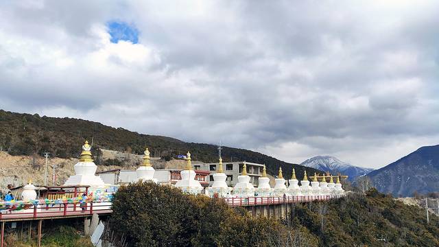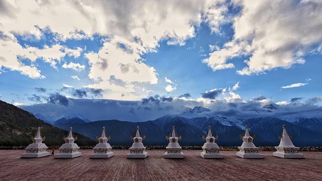 梅里13塔,这里除了的八座佛塔外,天降塔、神变塔、和谐塔各重复修建一座,另外两座 为声闻塔和缘觉塔。