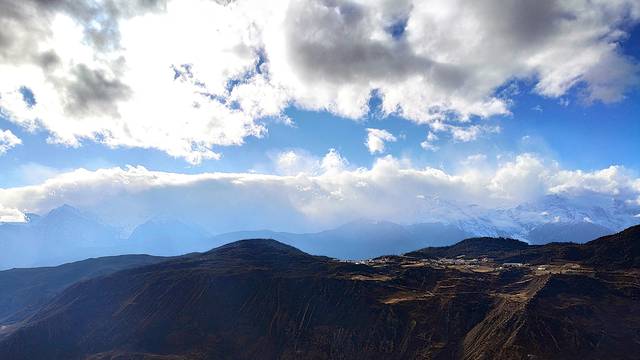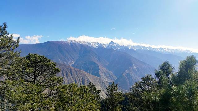 今天的天气非常不错,一大早就能看到“日照金山”。大概8点这样吧,正吃着早饭,只听有人在说“赶快去外面拍照,有日照金山”,我便跑了出去,拿起手机来着一张。