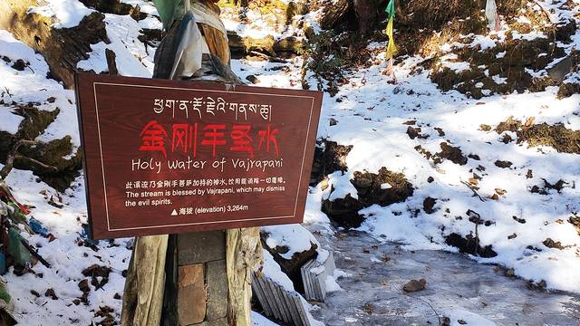 该溪水名为“金刚手圣水”,此溪流乃金刚手菩萨加持的神水,饮用能消除一切魔障。