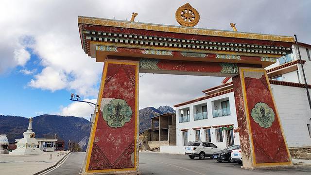 前观梅里雪山、背倚白马雪山,既能远观(朝拜)梅里雪山群峰,又融雪山、白塔以及人与自然和谐的“雪山远景+村寨+白塔近景”藏族村寨景观为一体;每到春季,村寨中桃花盛开,与前景的雪山红白相衬,分外妖娆,成为极具香格里拉意境的“雪山环抱的藏族村寨”。