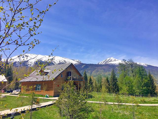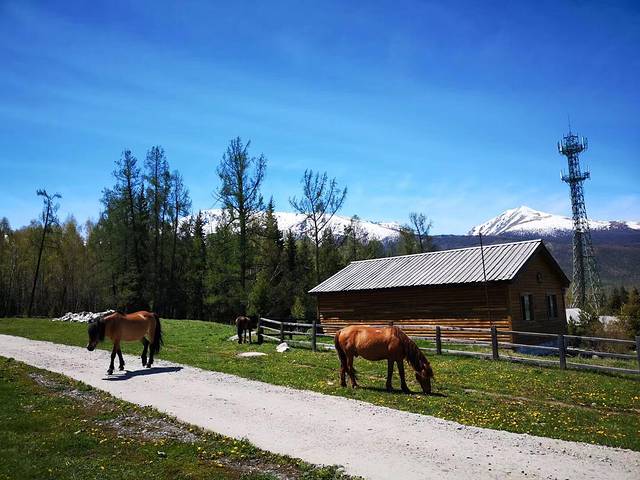 这是我们晚上要住的小木屋,背靠雪山,侧有骏马