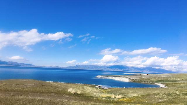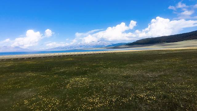 湖旁边是一片绿色的草还有散落其中的黄小花