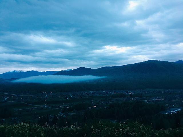 日落,爬回去小木屋时我转身一看,整个喀纳斯小镇有一种宁静致远的感觉