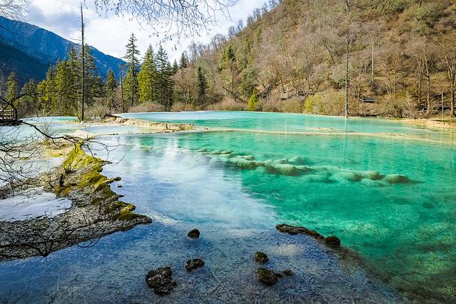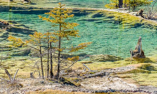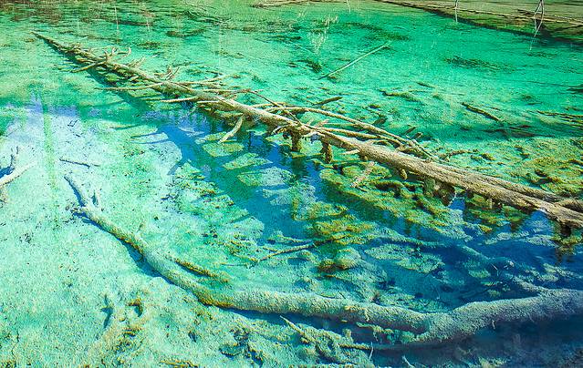 那凸凹不平的钙化塌陷,落入池中的交错树木,弯弯曲曲的藤蔓,舒卷飘逸的水草,大大小小的松球,在清澈澄碧的湖水里,宛如一件件精致的牙雕玉镂艺术品。