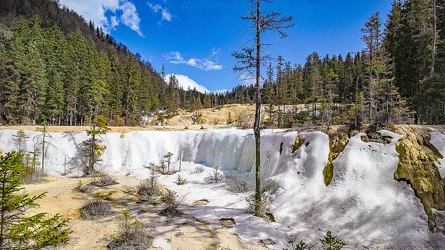 神仙池风景区,典型的地表喀斯特地貌,成片的山坡被黄色、乳白色钙质包裹,形成了2600个大小不等、水色明丽的水潭和高山湖泊,也就是当地人所说的“海子”和“钙化台地”。