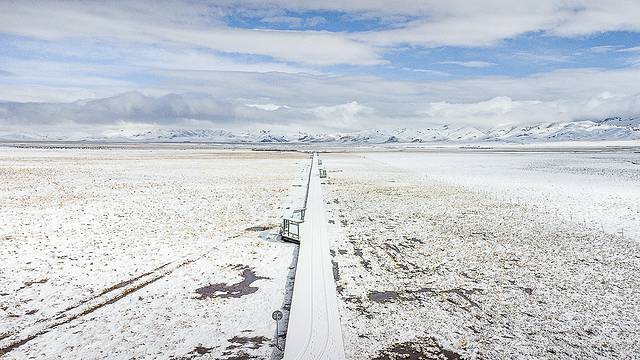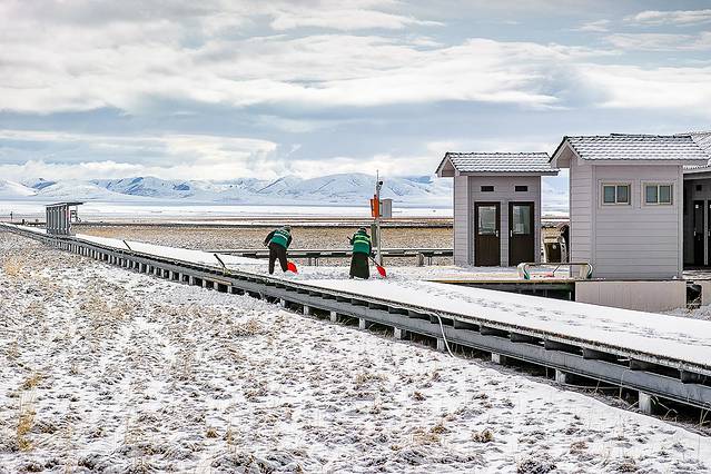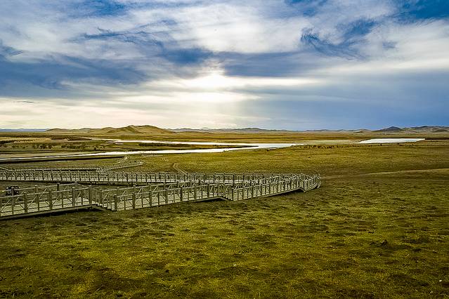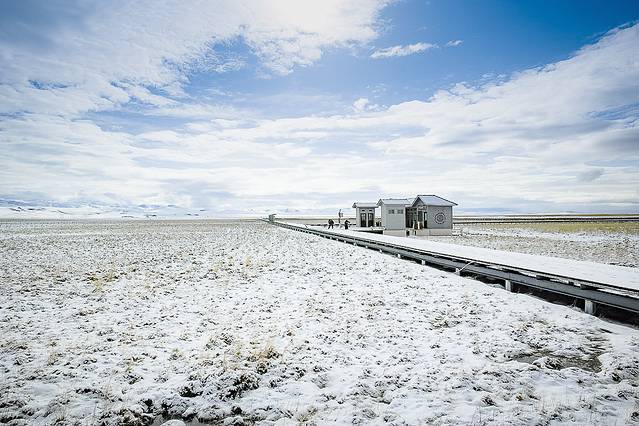 一条木栈道穿梭在天地之间,从你眼前穿过银色雪垫一路延伸到亭台尽头,仿佛沿着这条小路就能一直走到云彩的尽头、梦境的天边……这里就是你梦见过无数次的地方,若尔盖花湖。