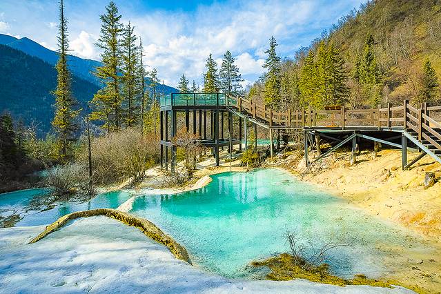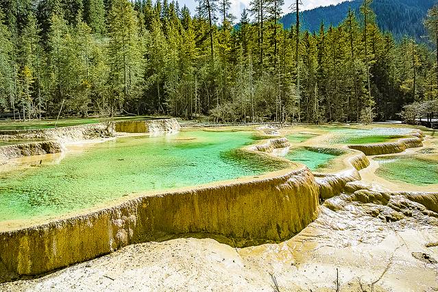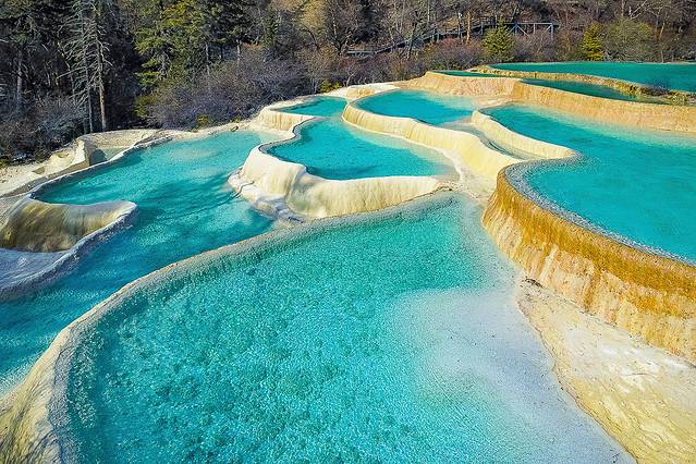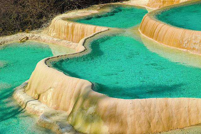 “莲台彩池”:它是景区钙化彩池最集中的区域,可以说是一池连着一池,大池套着小池。您站在上面往下看,那层层波光,是不是宛如颗颗宝石,正从高到低极致铺开?最下面是宁静而安详的青龙海,这般水景天成的绝世之美是无法用语言来形容和比拟的。