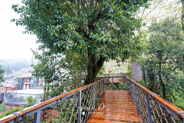 民宿分在好几栋中,而连接楼与楼间的是有趣的木桥,仿佛步行在森林之中。这样的设计也正好解决了民宿顺山势而建的爬坡问题。