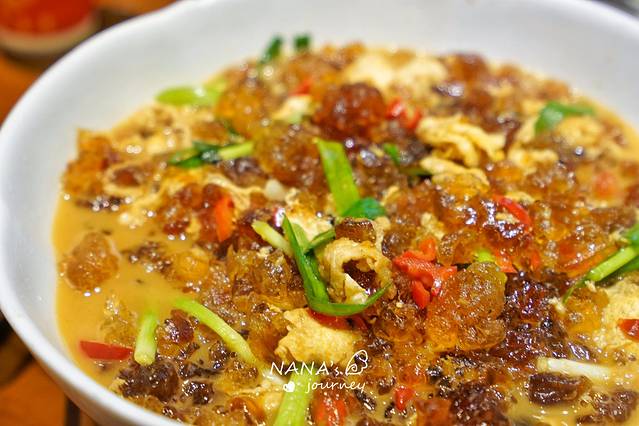 桃胶炒蛋,第一次看到把桃胶做在菜里,口感味道倒是很不错,很有创意的一道菜!