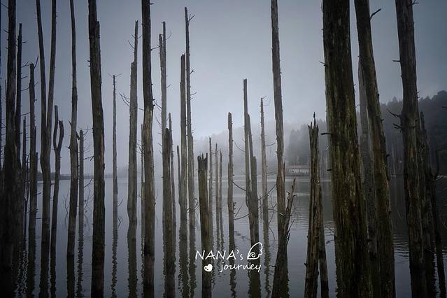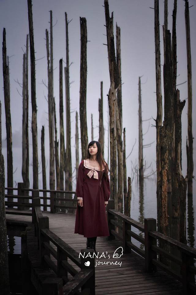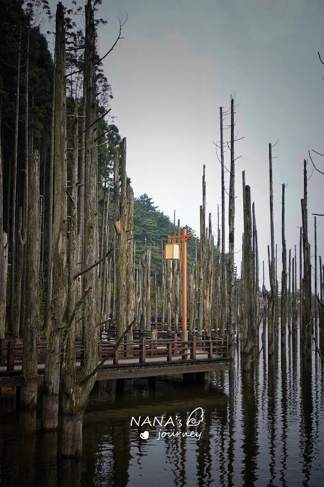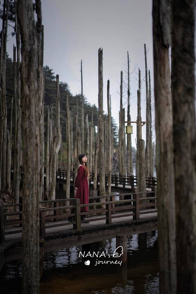 月亮湖的一侧有一片挺拔的水杉树干,直插湖底,因为上面没有绿色叶子了,所以看上去有一点荒凉。而恰恰是这份荒凉,配上点雾气,仿佛迷雾森林一般,充满神秘色彩。