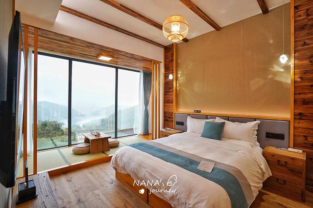当我进到自己的房间的时候,震惊了,大大的落地窗,榻榻米的设计,可以看到的远处的水库,睡觉的同时赏景会是多么惬意的事呀。
