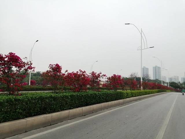 另外,民族大道竹溪立交桥上的三角梅也盛放了,红灿灿的,车辆穿梭其间,一路繁花似锦,像开在巨大的“红绸带”中,美得令人心醉。再往前,在民歌湖边的民族大道,一排木棉花也开了,红得夺目,随风摇曳,在这里生活,真是惬意啊。