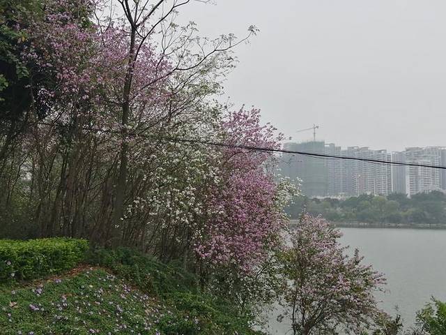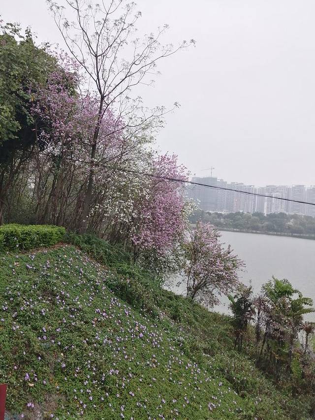 旁边就是相思湖,湖边开满洋紫荆花