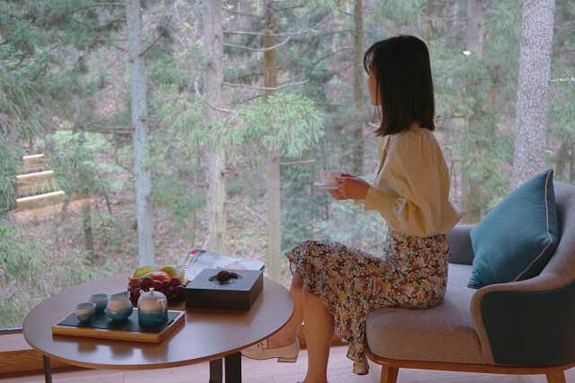 酒店隐匿在群山环绕中、溪水潺潺里,照进杉林的日光、拥抱蝉鸣的月色,抚慰心灵的纯净。