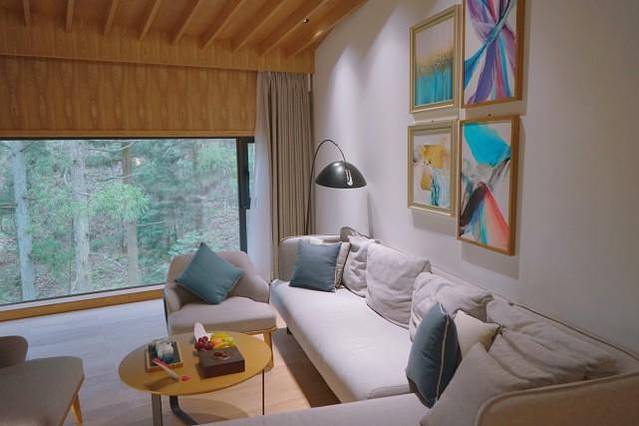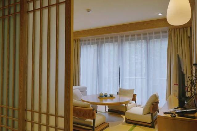 这是一间日系的榻榻米房间,面对窗外的林间绿意,喝上一壶茶,惬意舒适。