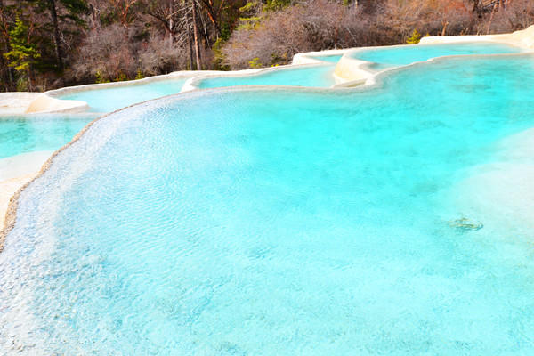 越走越精彩,接下来就到了景区的骄傲:“莲台彩池”。这也是一片钙化池,但比前面经过的瑶池规模更大,数量更多,更为壮观,引起我们一片惊叹。