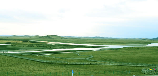 湖边是茂盛的水甜茅,春风荡起层层绿波,湖面闪射出一点或一大片粼粼波光,仿若跳动的音符。四周是无边无际的绿色平野与数百个大小湖泊随意地镶嵌在平畴绿野间和湛蓝天空中,好似颗颗璀璨的蓝宝石。