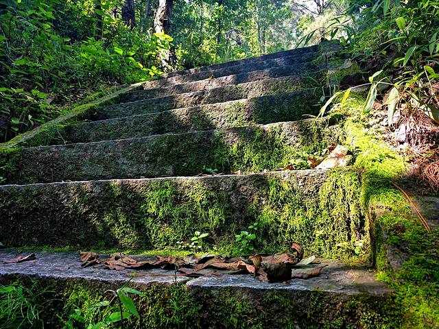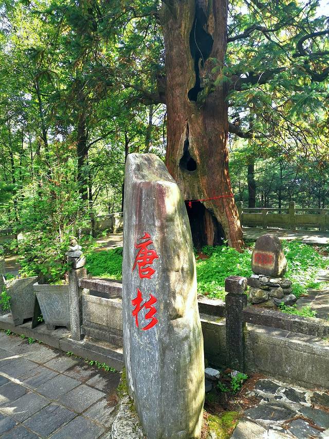 第二条线路是铺满石头的山道,也就是沿着第一个停车场的位置继续往上前行约1.5公里,就可以直接驱车到达无为寺。徒步顺着“无为腾境”穿过一道幽静的竹林,再走一段小道,顺台阶下去就到了,寺庙前面有棵千年唐杉,在这里看不到熙熙攘攘的人群,没有工作人员,敬香也是免费的,更不收取任何门票。