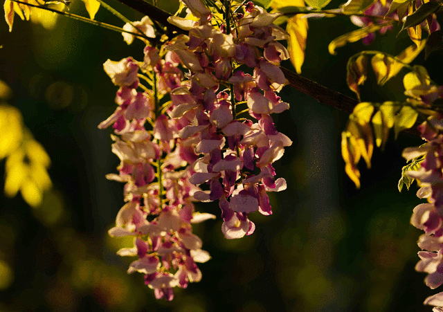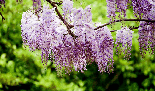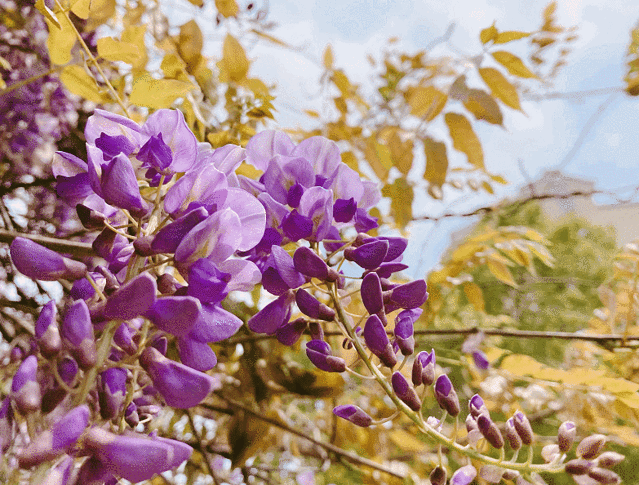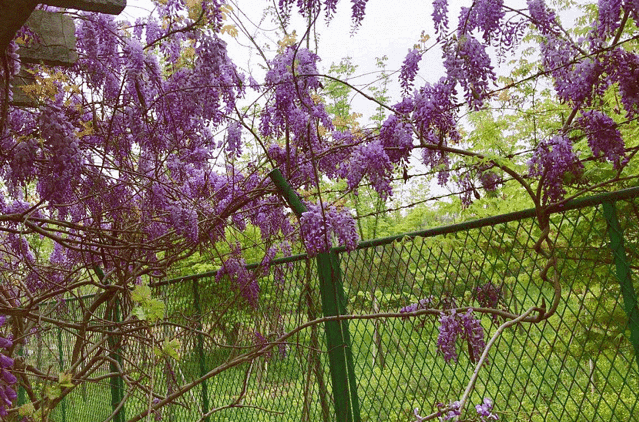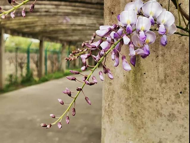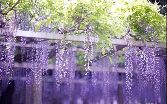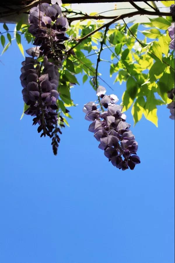 目光所及之处,紫藤花穗像是一串串熟透了的葡萄,又像一片片紫微微的祥云,灿如云霞般开得空幽而烂漫。