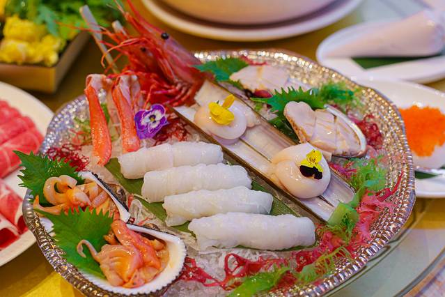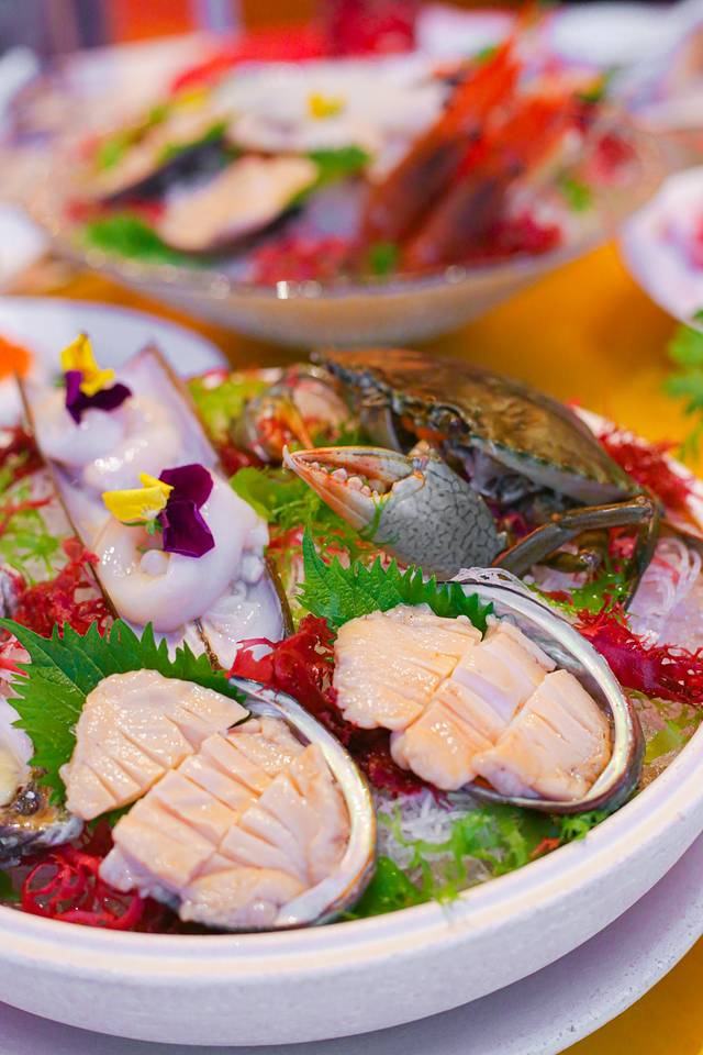 精选海鲜:配有超大的牡丹、日本松叶蟹腿、日本赤贝、蟹子墨鱼滑、鲍鱼、蛏子皇等,当然也有蔬菜拼盘以及水果、冰淇淋。