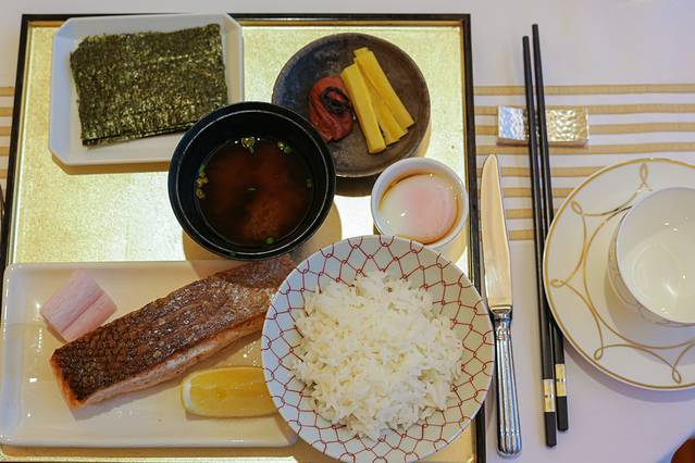 第二个早上我们预约了日式精选早餐,摆盘真的太精致了,越光米配温泉蛋和味增汤,那味道真的是绝了,还有超大的一块香煎三文鱼,我们都非常喜欢吃。