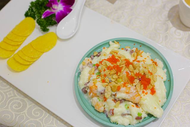 炒牛奶我还是第一次吃,淡淡的牛奶味吃到嘴巴里很香,上面还搭配了杏仁片和虾肉,不仅点缀了菜品,还增加了炒牛奶整体味道的层次感,灰常赞