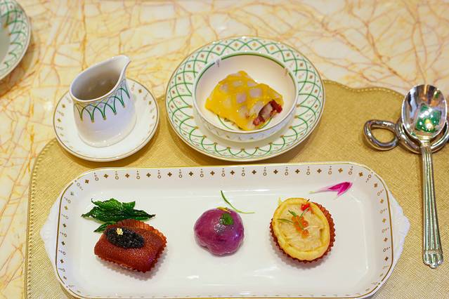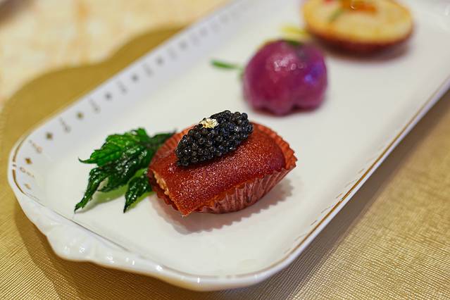 前菜黑鱼子配百花乳猪,从上至下依次是法国鱼子酱、烤乳猪皮、手打虾胶,最底下的虾肉Q弹绵软,中间的乳猪皮烤的非常酥脆,再搭配鱼子酱的鲜香,吃起来味道真的超级有层次感。