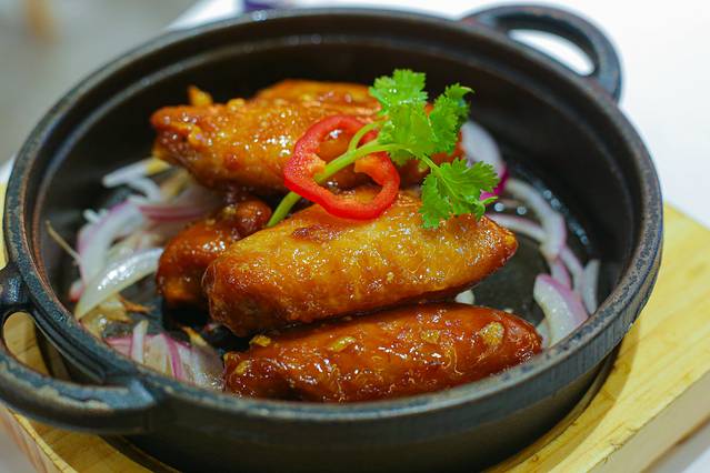 推荐榜NO.2陈皮花雕鸡翅煲,带一点甜味,不晓得是不是前期用蜂蜜腌制过鸡翅,所以吃起来汁水还是蛮浓郁的,这个完全不会辣,特别适合小孩子。一份有6个鸡翅,肉质比较软嫩,是我喜欢的味道。