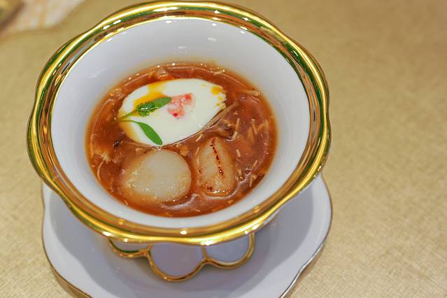 海皇酸辣羹,最让我眼前一亮的是采用了三种醋,分别是黑醋,红醋和意大利醋,搭配阿拉斯加蟹肉和大个的带子,整道菜吃起来味道非常有冲击感,大厨实在是有心了。