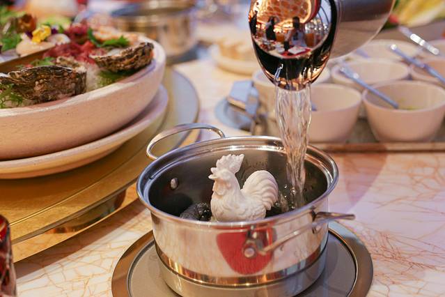 锅底,大约有十种锅底可以选择,喜欢吃辣的朋友红油锅自然不可错过,我点了餐厅的头牌椰奶乌鸡锅底,椰奶被做成了固体的小公鸡形状,甚是可爱,然后加入椰汁和乌鸡肉,瞬间就能闻到阵阵飘香。