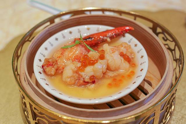 20年花雕蛋白蒸龙虾,采用法国最出名的Blue lobster龙虾其鲜味和浓味是最佳的,而最让人眼前一亮的是蛋白下面配了日本牛奶,其松软程度比豆腐还要软,从龙虾的鲜味到淡白的绵软,只有真正吃到嘴巴里才能感受到。