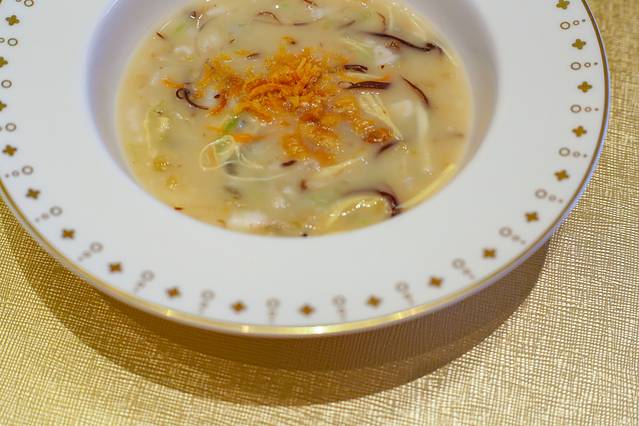 花胶鱼蓉羹,采用蒸鱼和炸鱼的搭配,也结合了鱼蓉羹最出名的顺德做法,经过大厨的改良,底汤内搭配花胶丝、竹荪丝、木耳丝,三丝爽脆的口感搭配清新的鱼肉,实在是一道不可多得的美味。
