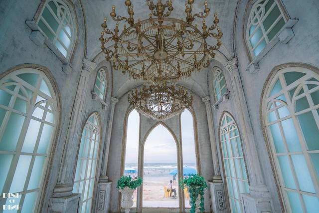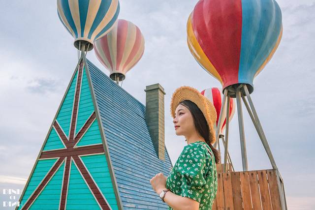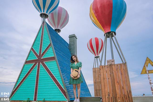 旁边的热气球小屋也是可可爱爱的,背后就是沙滩和大海,这个时候太阳还在云层里,等着最后的破茧而出。