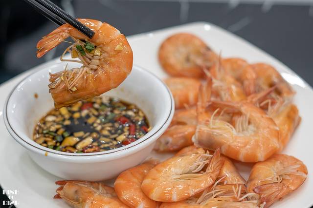 白灼基围虾:处理好的鲜虾肉质鲜甜无腥味,为了吃起来省事还可以提前让厨房把虾头去掉,蘸料也是秘制了超级好味