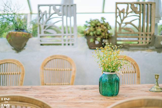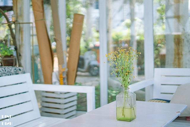 旧物改造他们家真的是用到了极致,墙边是拆下来的旧门版和废弃的老桌子,老灯,因为颜色和白、绿可以融合,所以也被老板搬了进来,摆放上一些花花草草,就神奇的融入了。