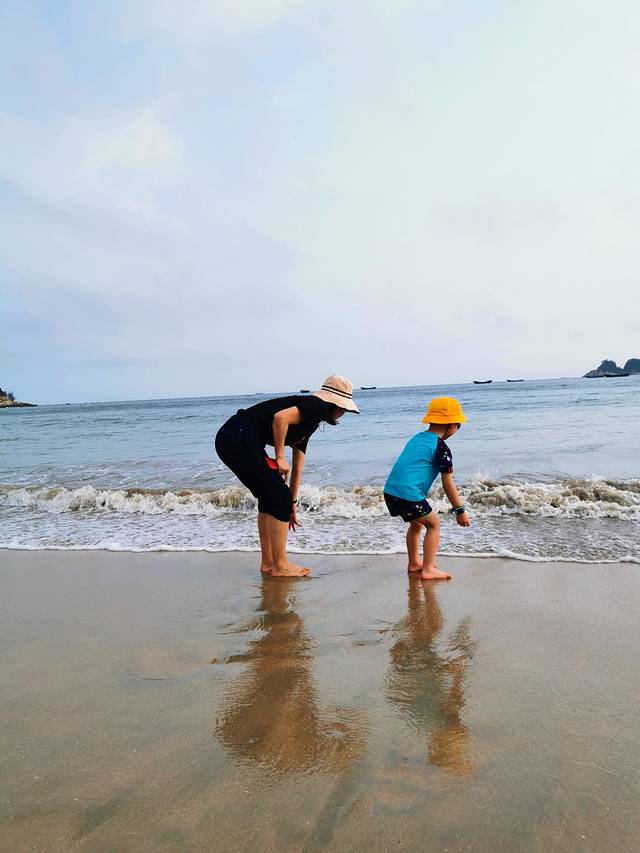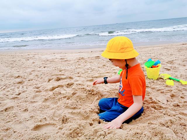 元小宝这个下午表现还是不错的,自己拿着挖沙工具玩,捉小螃蟹、捡贝壳、还和我一起搭了一个城堡,玩得不亦乐乎。