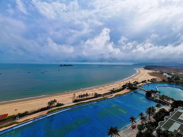 到阳江高铁站后取了车,就直奔海陵岛。天公不作美,路上下起了雨,雨势忽大忽小,好在刚到目的地雨就停了。我们预定的公寓在敏捷黄金海岸,挺大的一个楼盘,不同寻常的出入口设置,让我们绕了好几圈才找到公寓前台,预定的房间在另外一栋的17楼,正对大海,视野开阔,位置不错。