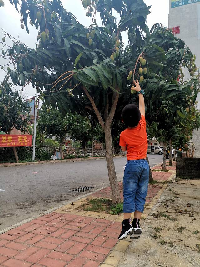 大排档旁的路边有很多芒果树,元小宝非得摘芒果,我偏不帮忙,看他笨拙的摘果子,有趣。