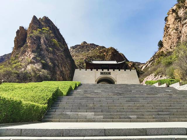 一座雄伟的大门在高高的石阶上面矗立着,给人一种膜拜的感觉。今天我们计划是上天沟进入,从猿人谷出来,再经过摩崖石刻长廊返回停车场。